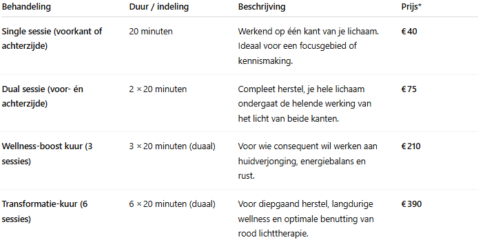 Rood licht stimuleert je lichaam op celniveau. Het dringt door tot diepere huidlagen, activeert de mitochondriën (je energiecentrales), en helpt zo je natuurlijke kracht te herontdekken. In deze serene ruimte brengen we moderne wetenschap en spirituele rust samen: het licht is je gids, je adem de weg, je lichaam het heiligdom.