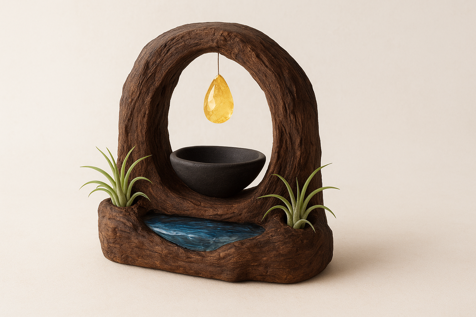 Uit natuurlijke holtes links en rechts groeien luchtplantjes, waardoor het geheel zichtbaar leeft. In het midden bevindt zich een verlaagde obsidiaan-kom, ideaal voor wierrook of een waxinelichtje.