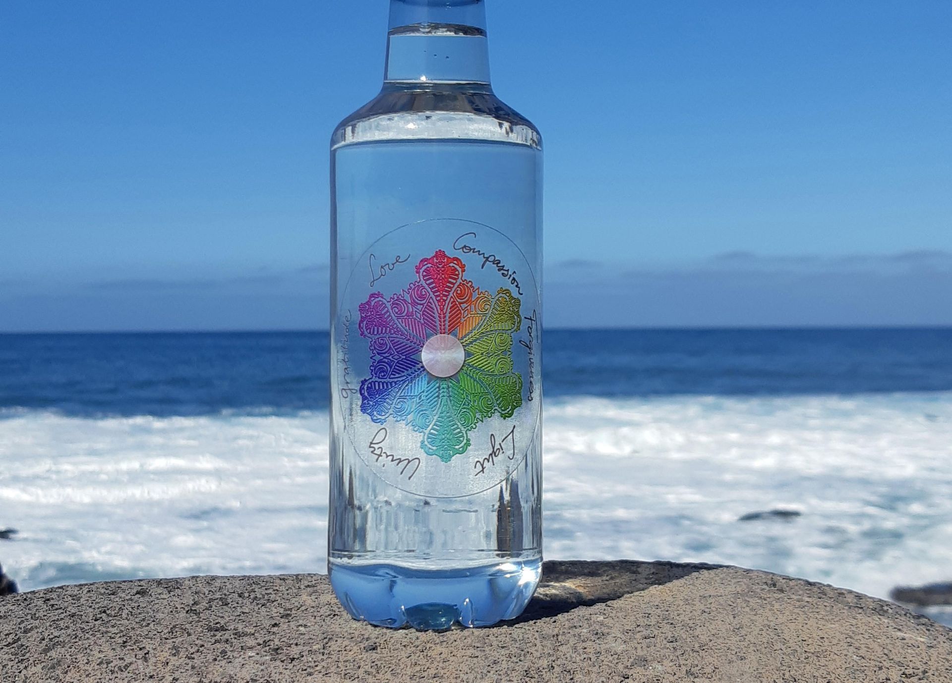 Aan de basis vloeit een element van blauw geblazen glas als een subtiele, symbolische waterval — een herinnering aan helderheid en beweging.